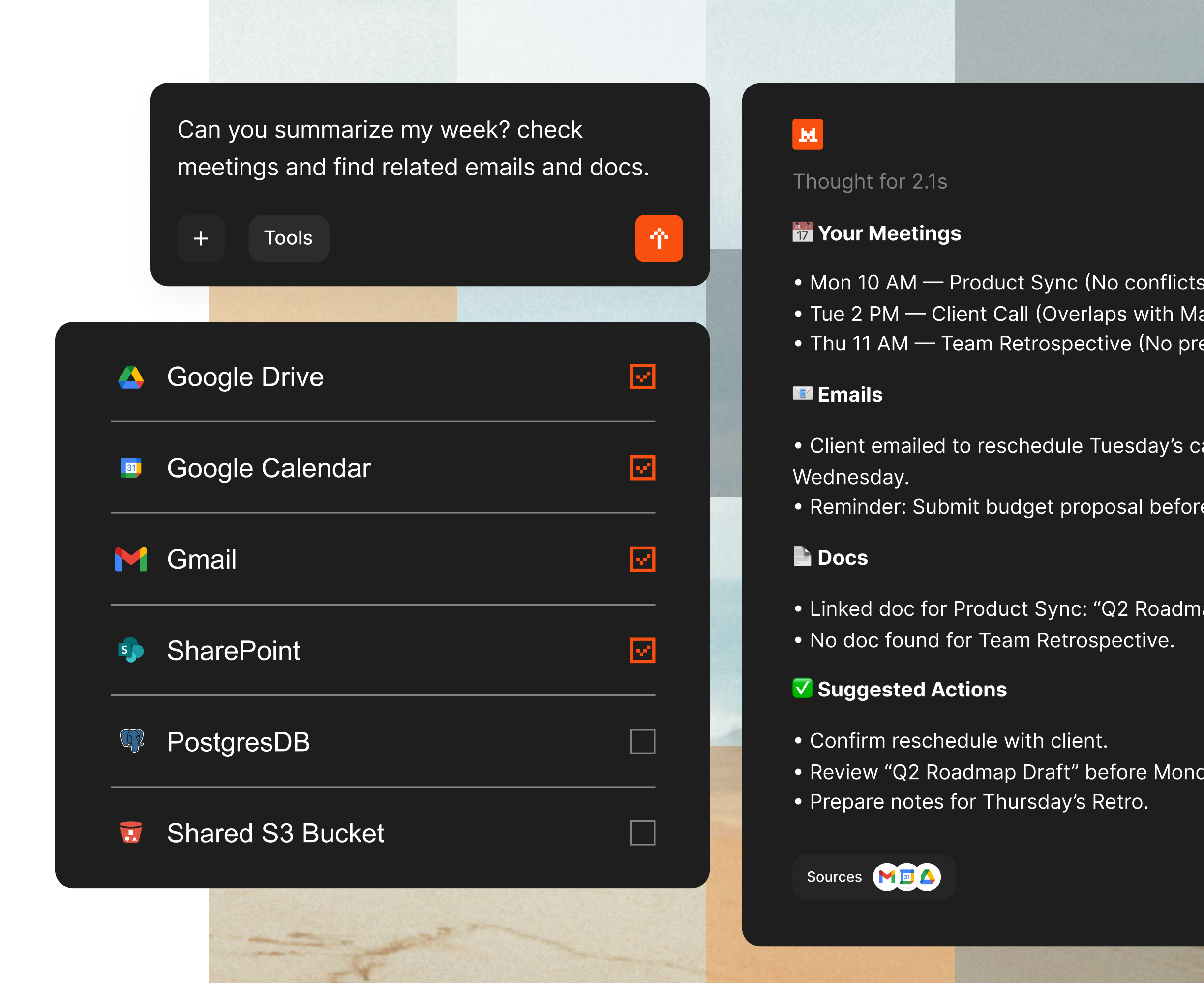 Automate tasks with AI agents connected to your apps and libraries.